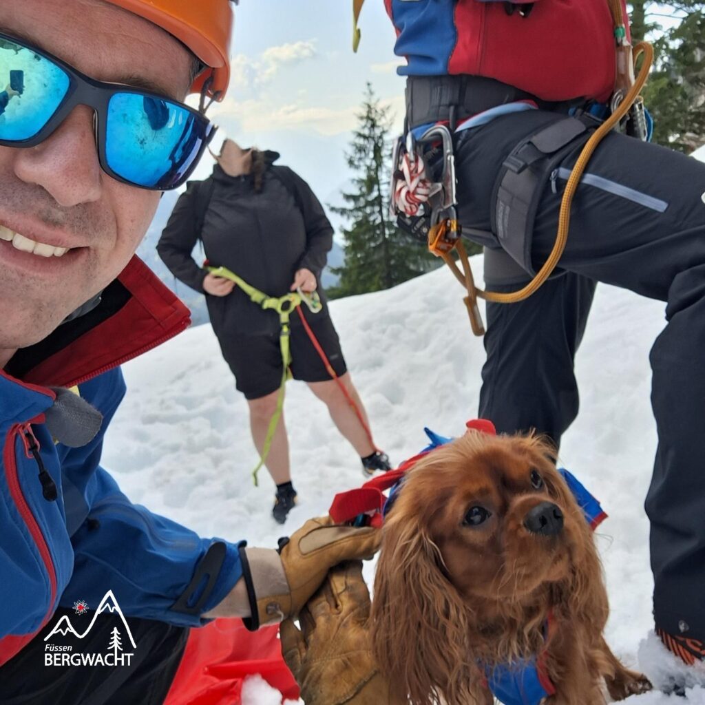Am Donnerstagnachmittag wurden die Einsatzkräfte der Bergwacht Füssen erneut alarmiert. Wieder an den Tegelberg und wieder auf den Ahornreitweg in Richtung Bleckenau und Schloss Neuschwanstein. Wieder hatte ein Urlauberpärchen die Situation am Berg unterschätzt und kam in einem der vielen Schneefelder nicht mehr vor noch zurück. Die Besonderheit dieses Mal, die beiden hatten die Kavalier Hundedame „Conny“ mit auf Ihrer abenteuerlichen Bergtour dabei.