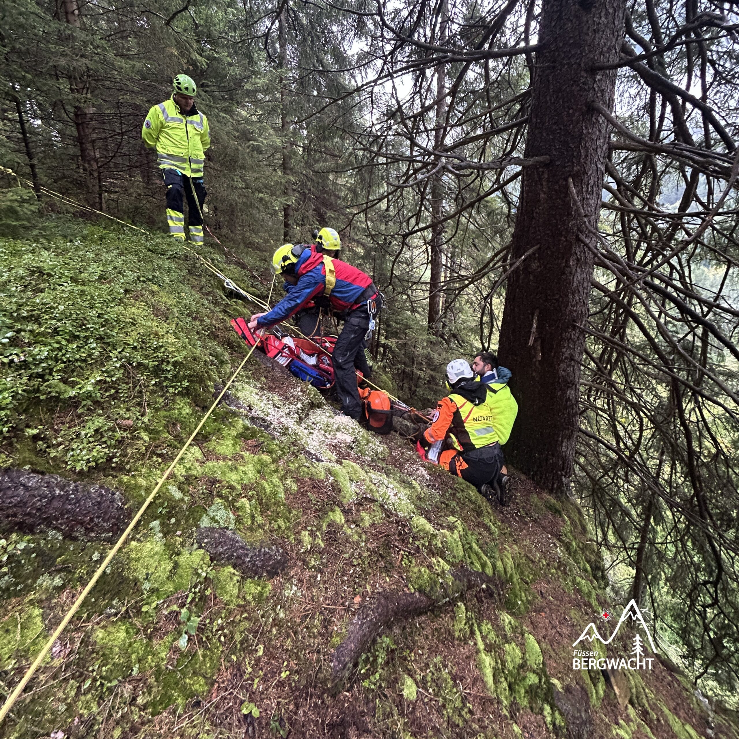 In vier sehr realitätsnahen Einsatzübungen mussten die Notärzte des Rettungshubschraubers nach einer eingespielten Alarmierung zu einem Holzer Unfall zusammen mit den Luftrettern der Bergwacht Allgäu die Szenarien unter Echtbedingungen abarbeiten. Die Herausforderungen hier waren zunächst einmal an die Einsatzstelle zu gelangen, das Team zu koordinieren, eine durchgängige Sicherung von Patient und Einsatzkräften zu gewährleisten, den Patienten in schwierigstem Gelände bestmöglich zu versorgen und wiederum in sicheres und winchbares Gelände zu verbringen. Hierbei wurden alle 5-6 Teammitglieder eines Einsatz-Szenarios maximal gefordert.