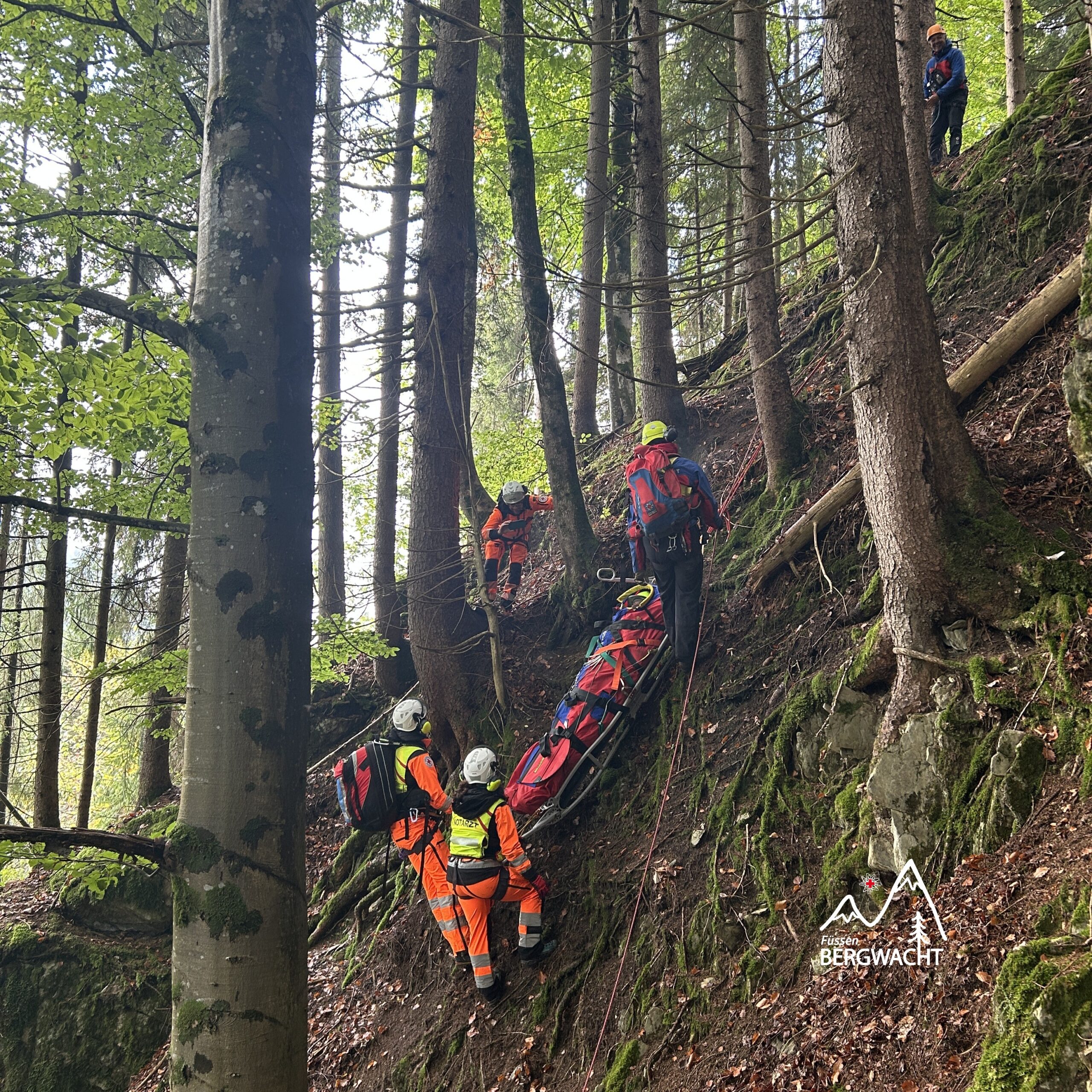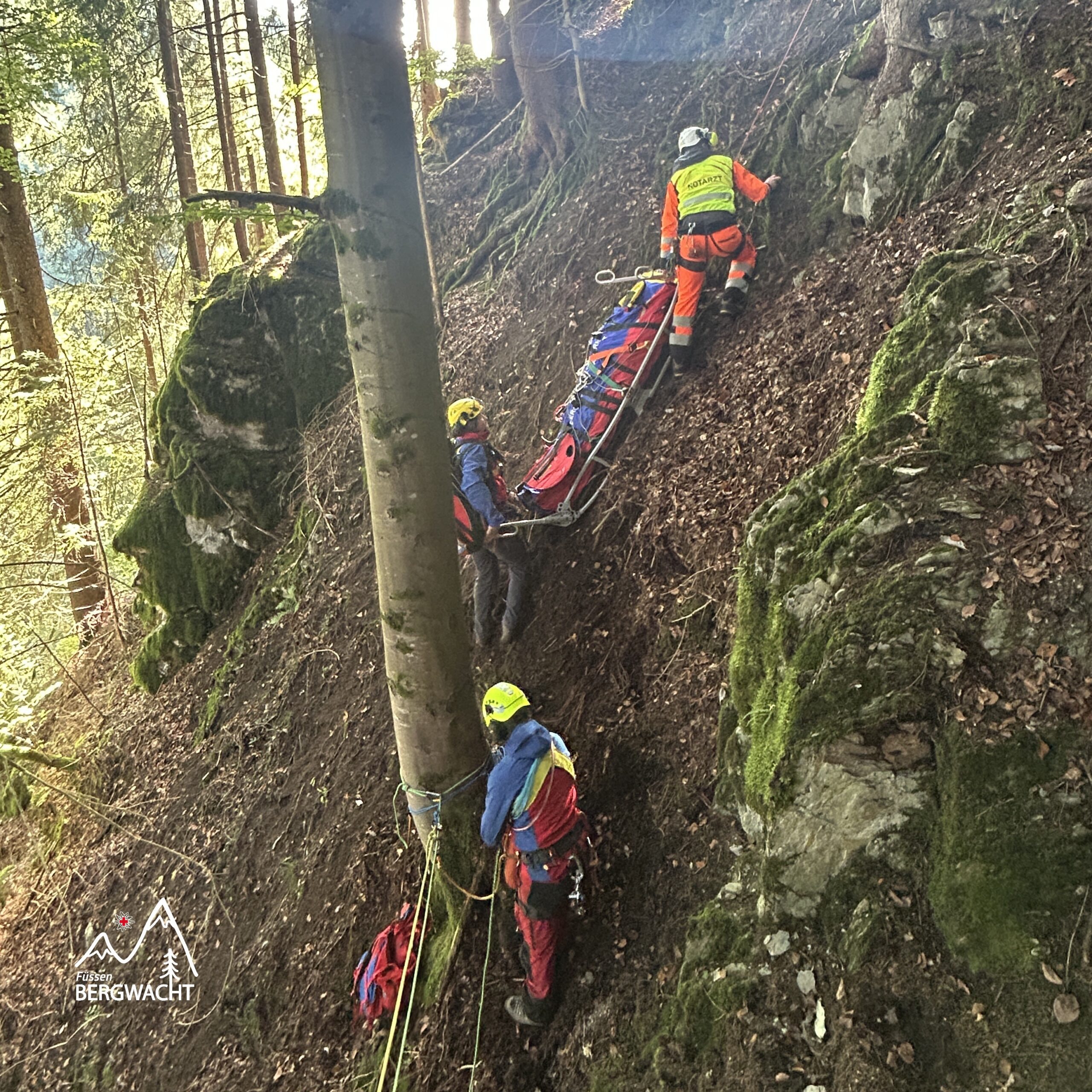 Trainingsinhalte im Stationstraining waren hierbei die Rettungstechniken Kapprettung aus einer Kletterroute, die Bergung mit einem Rettungsdreieck aus steilem Absturzgelände und der Winchvorgang mit dem Bergesack.