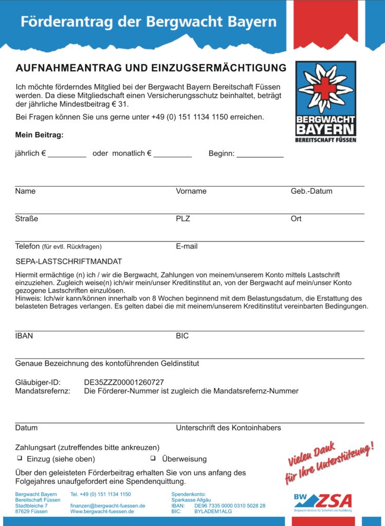 Diesen können Sie dann händisch ausfüllen und an die Bergwacht Füssen (Stadtbleiche 7, 87629 Füssen) per Post oder als Scan per Mail (finanzen@bergwacht-fuessen.de) senden.